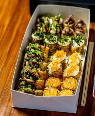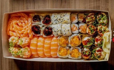 Combinado Love4 hot couve, 4 hot philadelphia, 4 selado, 4 uramaki philadelphia, 4 hossomami de salmão kani, 4 hot doritos, 4 niguiri, 4 joe, 6 hot kitamaki, 6 fa_as de sashimi salmão, 4 harumaki com creme de avelãR$ 150,00