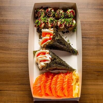 Combinado Individual2 philadelphia, 2 italia, 2 uramaki skin, 2 kani, 2 califórnia, 2 hossomaki de salmão,2 hossomaki de kani, 2 hossomaki salmão kani e 4 hot philadelphia (20 unidades)R$ 43,00