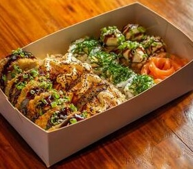 Combinado Eu E Ela4 hossomaki de salmão, 4 uramaki skin, 4 uramaki danashi, 4 uramaki suki,6 hot kitomaki, 4 uramaki tropical e 4 hot doce (30 unidades)R$ 68,00