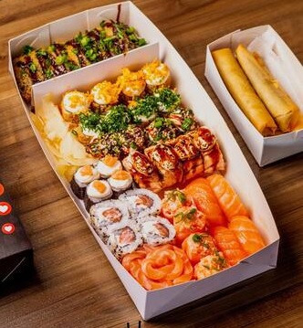 Combinado Love4 hot couve, 4 hot philadelphia, 4 selado, 4 uramaki philadelphia, 4 hossomami de salmão kani, 4 hot doritos, 4 niguiri, 4 joe, 6 hot kitamaki, 6 fa_as de sashimi salmão, 4 harumaki com creme de avelãR$ 150,00